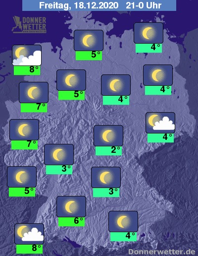 Die Temperaturen gehen von anfangs 6 bis 12 Grad bis kurz vor Mitternacht auf 2 bis 8 Grad zurück.
