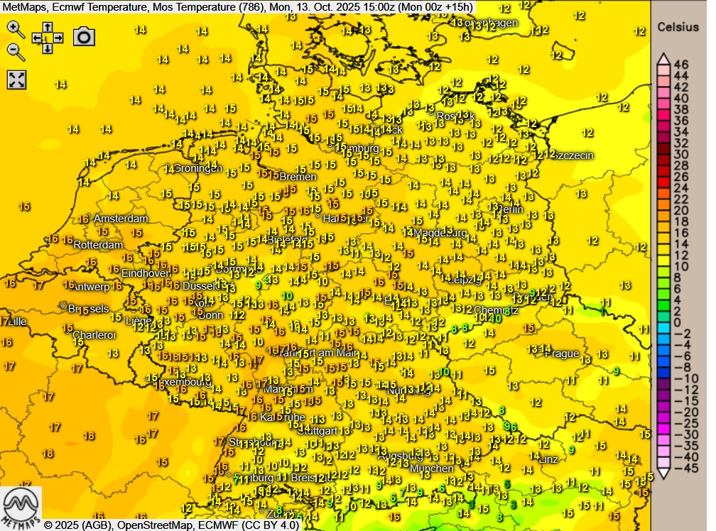 Die Wetter- und Temperaturkarte für Montagnachmittag (15:00 Uhr) nach Ecmwf: