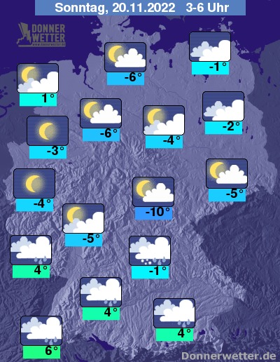 In der Nacht zum Sonntag fällt im Süden unter dichten Wolken zeitweise Regen, Schneeregen oder Schnee. Auch im Ostseeumfeld bleibt es meist bedeckt und hier und da ist etwas Schneefall möglich. Im Osten ist es teils stark, teils aufgelockert bewölkt und trocken, sonst ist es meist locker bewölkt oder sternenklar und ebenfalls trocken. Die Temperatur sinkt auf 6 Grad in Freiburg und bis auf eisige -10 Grad in Jena.