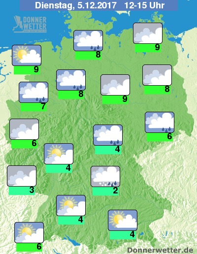 Heute Nachmittag sind im Westen neben dichten Wolken auch Auflockerungen möglich, dazu bleibt es hier weitgehend trocken. Im übrigen Land halten sich jedoch dichte Wolken und es fällt gebietsweise Regen, im Südosten auch Schneeregen oder Schnee. Die Temperatur liegt bei 2 bis 9 Grad.