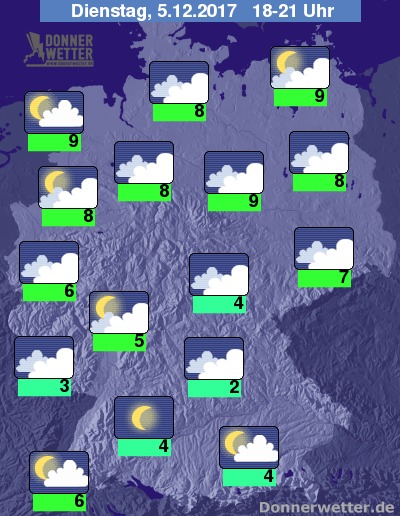 Heute Abend ist es über dem Alpenvorland meist sternenklar. Im Westen und übrigen Süden ist es teils aufgelockert, teils stark bewölkt und trocken. Im Rest der Republik halten sich meist dichte Wolken aus denen aber nur selten etwas Regen fällt. Die Temperatur liegt zwischen 2 und 9 Grad.