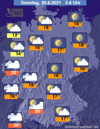 In der folgenden Nacht bleibt es über der Nordosthälfte der Bundesrepublik verbreitet sternenklar oder locker bewölkt und dazu trocken. Oft dichte Wolken ziehen über den Westen und Südwesten des Landes hinweg, dabei bilden sich hier gebietsweise Schauer und selten sind auch Gewitter möglich. Im übrigen Land ist es bei meist lockerer bis aufgelockerter Bewölkung trocken. Die Temperatur sinkt auf 20 Grad in Stuttgart und bis 12 Grad in Bremerhaven.