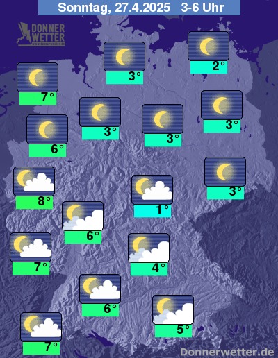 In der Nacht zum Sonntag ist es über dem Süden des Landes locker oder aufgelockert bewölkt. Über der Nordhälfte ist es hingegen verbreitet sternenklar. Es bleibt landesweit trocken bei Tiefstwerten von 8 Grad in Bonn und bis 1 Grad im Raum Jena.