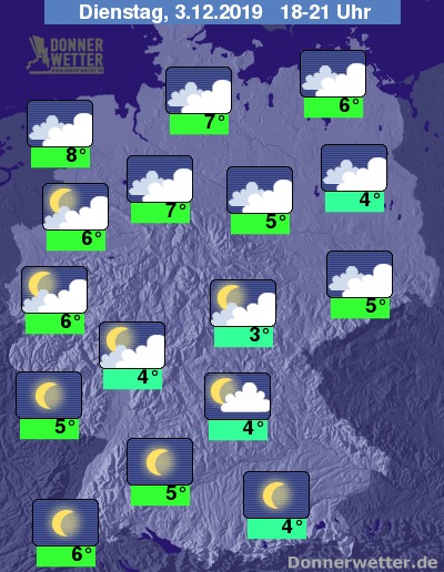 Am Abend halten sich im Norden und Nordosten zähe Wolken, aus denen es vereinzelt etwas tröpfeln oder nieseln kann, sonst klart der Himmel teilweise auf. Nach Süden und Südwesten hin zeigen sich häufig die Sterne.