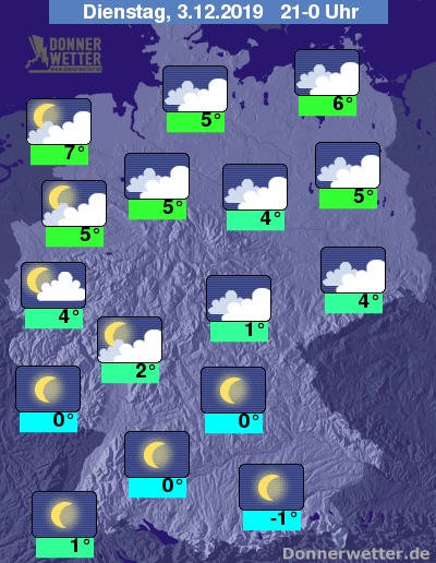 Bis zu den Frühstunden kühlt die Luft in der Mitte und im Süden auf frostige -5 bis 0 Grad ab und es kann zu überfrierender Nässe oder Reifglätte kommen. Im Norden gibt es nur örtlich leichten Frost. Am mildesten bleibt es mit 5 bis 6 Grad an den Küsten von Nord- und Ostsee.
