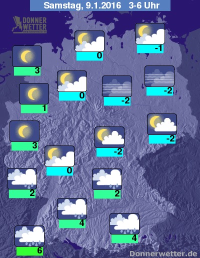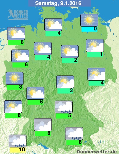 Am Samstag bleibt der Himmel über dem Süden Deutschlands weitgehend bedeckt, dabei zieht sich der Regen jedoch ins Alpenvorland zurück. Im übrigen Bundesgebiet scheint zwischen meist nur lockeren Wolken häufig die Sonne und vor allem am Vormittag ist es auch verbreitet sonnig. Nachmittags ziehen oft lockere Wolken durch, es bleibt jedoch trocken. Die Temperatur steigt auf örtlich 0 Grad in Vorpommern und bis etwa 10 Grad im Breisgau.