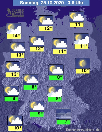 In der Nacht zum Sonntag ist der Himmel im Süden meist sternenklar, im Osten locker bis aufgelockert bewölkt und im Norden und Westen anfangs noch oft aufgelockert, jedoch zunehmend stark bewölkt. Gegen Morgen ist westlich von Niederrhein und Ems auch Regen möglich, sonst bleibt es trocken. Die Temperatur sinkt auf 14 Grad in Emden und bis 7 Grad im Raum München.