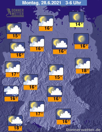 Am Montag ist es häufig heiter oder sonnig, im Tagesverlauf nimmt die Bewölkung von Westen her nach und nach zu und es ziehen oft dichte Wolken auf. Bis zum Abend sind dann über der Westhälfte der Bundesrepublik vielerorts Schauer und örtlich auch Gewitter möglich. Weiter nach Osten hin bleibt es hingegen trocken. Die Höchstwerte erreichen 22 Grad an der Nordsee und bis 31 Grad in Berchtesgaden.
