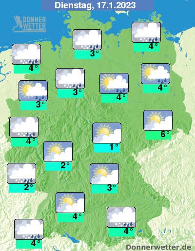 Am Dienstag zeigen sich hier und da heitere Abschnitte, jedoch ziehen oft dichte Wolken durch und vor allem am Vormittag fällt im Norden noch häufig Schnee oder Regen. Im übrigen Land fällt nur gelegentlich etwas Regen oder Schnee. Die Temperatur steigt auf nasskalte 1 Grad in Erfurt und bis 6 Grad in der Lausitz. An den Küsten herrscht zum Teil Sturm.