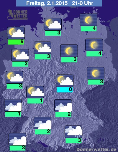 In der Nacht zum Samstag bleibt es im Süden des Landes stark bewölkt oder bedeckt, stellenweise bildet sich Nebel, aber auch im Westen ziehen wieder zunehmend dichte Wolken auf, dazu bleibt es weitgehend trocken. Im Norden und Osten Deutschlands ist es überwiegend locker bis aufgelockert, gebietsweise aber auch stark bewölkt, hier bleibt es trocken. Die Temperatur sinkt auf 5 Grad im Emsland und bis -2 Grad im Grabfeld. Im Norden weht weiterhin ein teils stürmischer, im Küstenumfeld ein teils orkanartiger Wind.