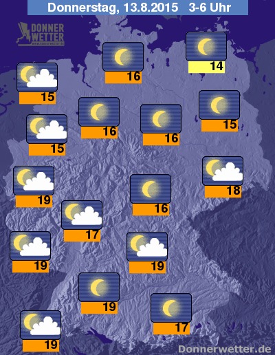 In der Nacht zum Donnerstag zeigt sich der Himmel zum größten Teil sternenklar, besonders in den westlichsten Landesteilen und gebietsweise im Süden können aber auch lockere Wolken durchziehen, dazu bleibt es jedoch trocken. Die Temperatur sinkt auf 19 Grad entlang des Ober- und Mittelrheins und auf etwa 14 Grad an der Müritz.