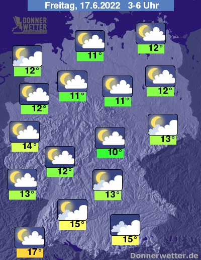 In der Nacht zum Freitag ziehen einige, meist noch aufgelockerte, teils aber auch dichte Wolken durch, dazu bleibt es trocken. Die Temperatur sinkt auf 17 Grad im Breisgau und bis 10 Grad im Eichsfeld.