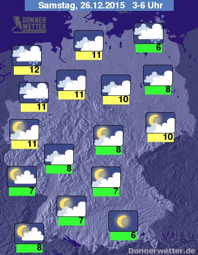 In der folgenden Nacht bleibt es vor allem über Norddeutschland dicht bewölkt und es fällt zeitweise Regen oder Sprühregen. Über der breiten Mitte ist es oft stark, hier und da aber auch aufgelockert bewölkt und dazu weitgehend trocken. Im Süden zeigt sich der Himmel zum Großteil locker bewölkt bis aufgelockert bewölkt, hier bleibt es trocken. Die Temperatur sinkt auf 12 Grad an der Nordsee und bis 6 Grad in München. Im Norden weht verbreitet frischer bis starker und in Böen stürmischer Wind, auf den Bergen und an den Küsten ist es stürmisch mit Sturmböen.