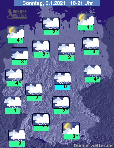 In der Nacht zum Montag bleibt es lediglich im Nordseeumfeld und im Südosten des Landes meist trocken, jedoch überwiegend stark bewölkt. Über der restlichen Republik halten sich dichte Wolken und es fällt immer wieder Schnee, Schneeregen oder Regen. Die Temperatur sinkt auf 3 Grad in Stralsund und bis -1 Grad am Hunsrück.