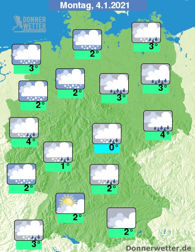 Am Montag bleibt es verbreitet dicht bewölkt oder neblig-trüb, im Südosten bleibt es dabei immerhin weitgehend trocken, sonst fällt jedoch zeitweise Regen, Schneeregen oder Schnee. Die Temperatur steigt auf 0 Grad im Grabfeld und bis 4 Grad im Raum Köln.
