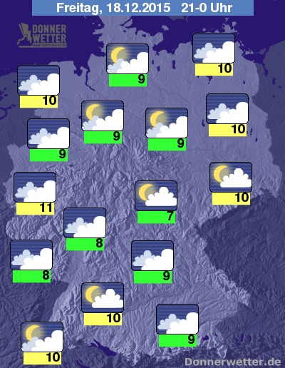 Heute Abend zeigt sich der Himmel über Deutschland mehrheitlich stark bewölkt, jedoch sind zwischen den Wolken auch immer wieder Auflockerungen möglich. In Sachsen und Baden-Württemberg ist es auch häufig nur locker bewölkt. Es bleibt landesweit trocken bei Abendwerten von 11 Grad im Rheinland und um 7 Grad im Eichsfeld.