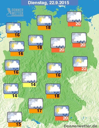 Heute ziehen immer wieder dichte Wolken übers Land und es fällt dabei zeitweise Regen, zwischendurch kann die Bewölkung aber auch mal aufheitern und der Sonne Platz machen. Im Norden und Westen Deutschlands können sich zudem auch einzelne, meist kurze Gewitter bilden. Die Temperatur steigt auf 14 Grad im Bliesgau und bis 22 Grad in Dresden.