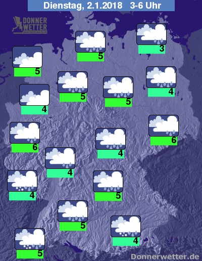 In der folgenden Nacht bleibt es von der Nordsee bis zum Emsland stark bewölkt, jedoch trocken, sonst fällt bei dichten Wolken immer wieder Regen. Im Alpenvorland auch Schneeregen oder Schnee. Die Temperatur liegt bei 3 bis 6 Grad.