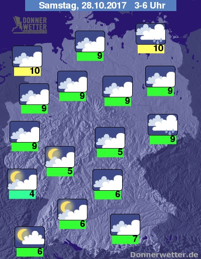 In der Nacht zum Samstag bleibt die Wolkendecke über der Nordhälfte des Landes verschlossen, dazu ist an der Ostsee und über Sachsen etwas Regen möglich, sonst bleibt es trocken. Weiter nach Süden und Südwesten ist der Himmel mehr und mehr aufgelockert bewölkt, hier bleibt es trocken. Die Temperatur sinkt auf 10 Grad an den Küsten und bis 4 Grad am Pfälzer Wald. An den Küsten weht ein zunehmend starker bis stürmischer Wind.