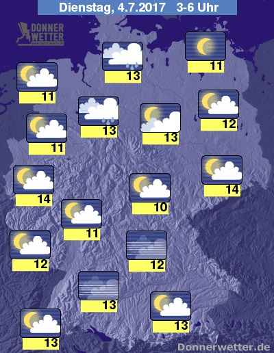 In der kommenden Nacht ziehen über den Norden gebietsweise dichte Wolken aus denen sich einzelne Schauer bilden. Im übrigen Bundesgebiet ist der Himmel hingegen meist locker bewölkt und häufig auch sternenklar, dazu bleibt es trocken. Die Temperatur sinkt auf 14 Grad in Dresden und bis etwa 10 Grad an der Müritz.