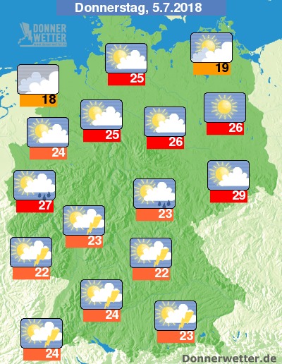 Am Donnerstag ist es über der Nordhälfte verbreitet heiter, hier und da ziehen auch einige Wolken durch, dabei bleibt es aber trocken. Weiter nach Süden hin zieht dagegen wechselnde, zum Teil starke Bewölkung durch, dabei bilden sich gebietsweise Schauer, zudem sind auch Gewitter möglich. Die Temperatur steigt auf 18 Grad an der Nordsee und bis 29 Grad in der Lausitz.