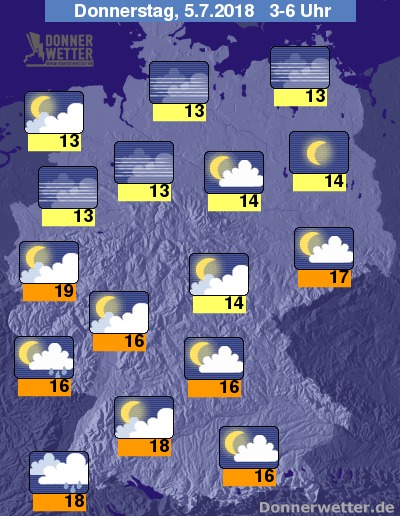 In der folgenden Nacht ist der Himmel über der Südhälfte teils wechselnd, teils auch stärker bewölkt, am Oberrhein sind dazu lokale Schauer oder Gewitter möglich, sonst bleibt es trocken. Weiter nach Norden hin ist es lediglich locker bewölkt oder sternenklar, dazu bleibt es ebenfalls trocken. Die Temperatur sinkt auf 19 Grad in Bonn und bis 13 Grad an der Müritz.