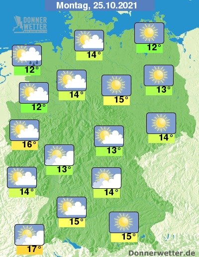 Am Montag zeigt sich das Wetter zunächst verbreitet sonnig, im Tagesverlauf ziehen jedoch von Westen her oft einige, in den westlichen Landesteilen auch dichte Wolken heran, dabei bleibt es aber trocken. Die Temperatur erreicht 12 Grad in Emden und bis 17 Grad in Freiburg.