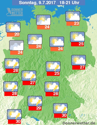 Heute Abend nimmt die Bewölkung über der Südhälfte des Landes noch weiter zu und es können sich hier und da Schauer sowie einzelne, teils kräftige Gewitter entwickeln. Im Norden bleibt es bei wechselnder Bewölkung trocken. Die Temperatur liegt anfangs noch bei 20 Grad an der Nordsee und bis 30 Grad im Breisgau.