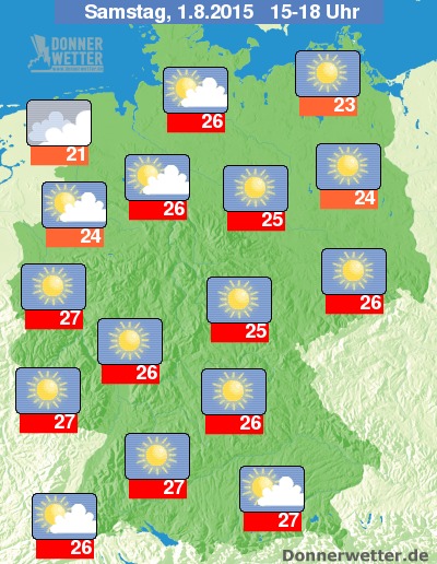 Heute Nachmittag ist es verbreitet heiter oder sonnig, gebietsweise ziehen aber auch mal einige Wolken durch. Nach Nordwesten hin halten sich vor allem in Nordseenähe teils dichtere Wolken, dazu bleibt es trocken. Im Süden kann es auch öfter stark bewölkt sein, dabei besteht besonders am Alpenrand ein erhöhtes Schauer- und Gewitterrisiko, im übrigen Bundesgebiet bleibt es jedoch trocken. Die Temperatur steigt auf 21 Grad an der Nordseeküste und bis auf sommerliche 27 Grad im Oberrheingraben.