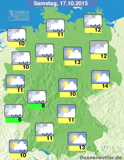 Am Samstag ziehen vor allem über die Westhälfte und den Norden oft dichte Regenwolken, dabei sind nur hier und da kurze Auflockerungen zu erwarten. Sonst kann sich bei oft wechselnder und teils starker Bewölkung die Sonne häufiger blicken lassen und es bleibt weitgehend trocken. Es werden 8 bis 14 Grad erreicht.