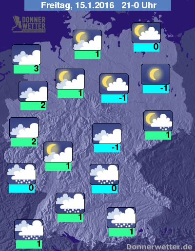Heute Abend fällt besonders im Süden Deutschlands teils kräftiger und ergiebiger Schnee, dabei sind neben schneeglatten Straßen auch örtliche Schneeverwehungen möglich! Über der breiten Landesmitte bleibt es überwiegend stark, teils auch aufgelockert bewölkt, dabei ist gebietsweise leichter Schneefall möglich. Im Nordwesten und äußeren Norden ist es ebenfalls stark bewölkt, jedoch meist trocken, sonst ist der Himmel im Norden jedoch meist locker bewölkt, zum Teil auch sternenklar und es bleibt dazu trocken. Die Abendtemperatur liegt bei 3 Grad in Ostfriesland und um -1 Grad in Berlin. Im Süden des Landes weht ein teils starker Wind.