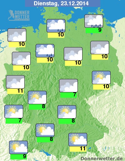 Am Dienstag kann sich südlich der Donau, nach örtlicher Nebelauflösung, häufig die Sonne zeigen, dazu bleibt es hier tagsüber auch trocken. In den nördlicheren Landesteilen bleibt es dagegen weitgehend bedeckt und im Norden fällt dabei auch zeitweise Regen, sonst bleibt es zumeist trocken. Von der breiten Mitte bis ins nördliche Deutschland weht weiterhin ein frischer und teils starker, an der See und in Böen auch ein teils stürmischer Wind. Die Temperatur steigt auf 7 Grad im Grabfeld und bis 11 Grad in Köln.