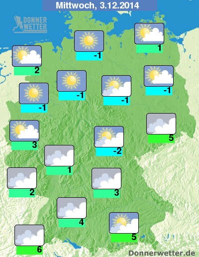 Am Mittwoch halten sich häufig dichte Wolken oder es hält sich zäher Hochnebel, dabei fällt aber nur noch gelegentlich mal etwas Schnee, Schneeregen oder Regen. Im Norden kann sich der Nebel oder Hochnebel oft auflösen und gebietsweise zeigt sich die Sonne, dabei bleibt es hier trocken. Die Temperatur steigt auf -2 Grad im Thüringer Becken und bis 6 Grad im Breisgau.