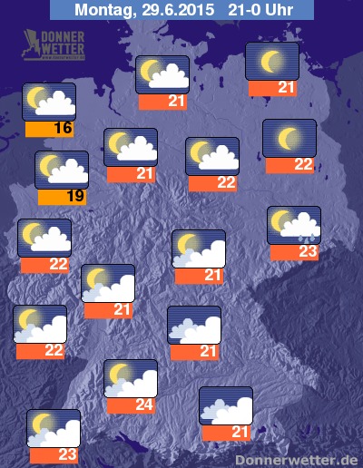 Heute Abend sind in Sachsen letzte Schauer und Gewitter möglich, sonst lockert der Himmel verbreitet auf und zum Teil wird es auch sternenklar, dazu bleibt es trocken. Die Abendtemperatur liegt bei 23 Grad im Breisgau und kühleren 16 Grad in Ostfriesland.