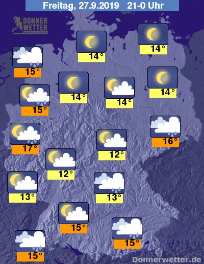 Am Abend regnet es in einem Streifen vom Oberrhein bis nach Sachsen. Auch südlich der Donau können teilweise Regen- oder Schauerwolken aufziehen. Im übrigen Land wechseln sich kurze freundliche Abschnitte mit Schauerwolken ab. Vereinzelt kann es auch blitzen und donnern. Im Rhein-Main-Gebiet und im Westen kann man die untergehende Sonne am ehesten beobachten.