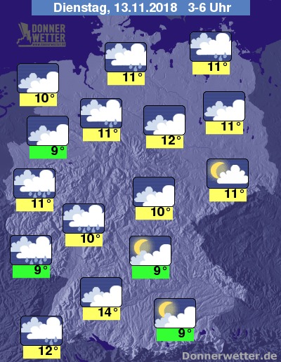 In der Nacht sowie in den frühen Morgenstunden dominiert im Land eine geschlossene Wolkendecke, in der gesamten Westhälfte sowie an den Küsten kann es zudem teils auch kräftiger regnen. Einzelne Wolkenlücken zeigen sich meist nur im äußersten Südosten Deutschlands.