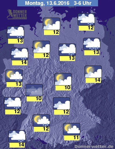 In der bevorstehenden Nacht ist es von Bayern bis nach Sachsen oft aufgelockert bewölkt und dazu trocken. Im übrigen Bundesgebiet dominieren jedoch größtenteils dichte Wolken das Wettergeschehen und es kann zeitweise regnen. Gewitter bleiben eher die Ausnahme. Die Temperatur sinkt auf 14 Grad in Osnabrück und bis 10 Grad im Thüringer Becken.