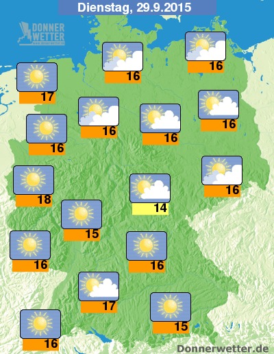 Heute können im Norden und Osten zeitweise einige, gebietsweise auch mal etwas dichtere Wolken durchziehen. Im übrigen Bundesgebiet ist es hingegen verbreitet sonnig und es ziehen nur selten ein paar Wolken durch. Es bleibt trocken, dabei steigen die Temperaturen auf 14 Grad im Eichsfeld und bis 18 Grad in Köln.