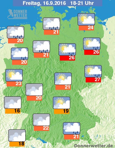 Heute Abend ist es im Norden und Osten, sowie im Alpenvorland überwiegend stark bewölkt, dazu bilden sich zeitweise Schauer und es sind auch Gewitter möglich. In den übrigen Landesteilen ist es teils stark bewölkt, hier und da zeigen sich jedoch auch heitere Abschnitte, dabei bleibt es meist trocken. Die Temperatur liegt bei 16 Grad am Pfälzer Wald und etwa 27 Grad in Dresden.