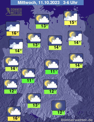 In der folgenden Nacht halten sich über dem Norden meist viele und oft dichte Wolken. Im übrigen Land ist es hingegen meist nur leicht bis wechselnd bewölkt. Es bleibt landesweit trocken bei 16 Grad im nördlichen Emsland und 11 Grad im Vogtland.