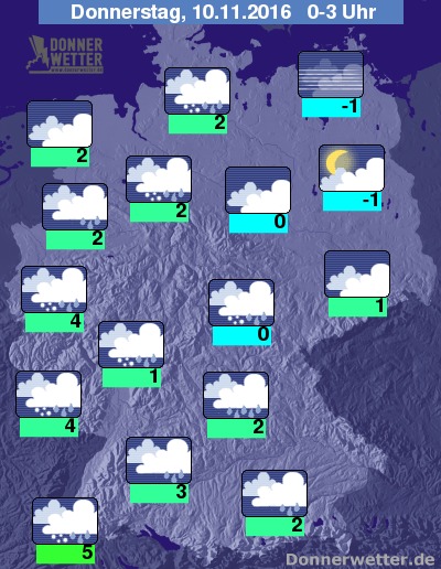 In der ersten Nachthälfte wird es sehr frisch mit minus 1 Grad C im Nordosten und 4 Grad C im Westerwald. Zudem kommt es im Westen und Süden des Landes zu Regenschauern oder Schneeregen, in hohen Lagen kann es auch schneien. Der Himmel ist weiterhin bedeckt. Im Nordosten tritt gebietsweise Nebel auf.