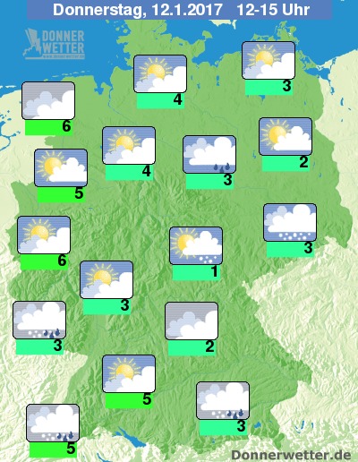 Die Höchstwerte liegen zwischen 1 Grad im Thüringer Bergland und 6 Grad an der Nordseeküste.