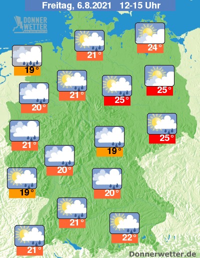 Heute Abend ist es zum Teil heiter, jedoch ziehen auch vielerorts dichte Wolken durch, dabei können sich einzelne Schauer, im Norden örtlich auch Gewitter bilden. Im Süden bleibt es jedoch trocken. Die Temperatur liegt bei 20 Grad im Saargau und bis 24 Grad in der Lausitz.