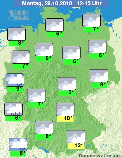 Am frühen Nachmittag fällt in der Westhälfte und im Südwesten aus kompakten Schichtwolken zeitweise Regen und Sprühregen. Im Norden und Osten gibt es meist trockene Wetterverhältnisse. Die 10 Grad C Marke wird wohl nur das Gebiet um Bayern und Franken erreichen. Dabei herrschen mäßige Windböen und die Sonne zeigt sich so gut wie kaum im ganzen Land.