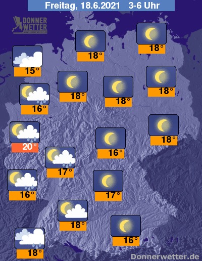 In der Nacht zum Freitag ist es über der Republik größtenteils sternenklar. In den westlichen Landesteilen ziehen jedoch zum Teil dichte Wolken auf und es können sich regional Schauer und auch Gewitter bilden, sonst bleibt es trocken. Die Temperatur sinkt auf tropische 20 Grad in Köln und bis 15 Grad in Wilhelmshaven.