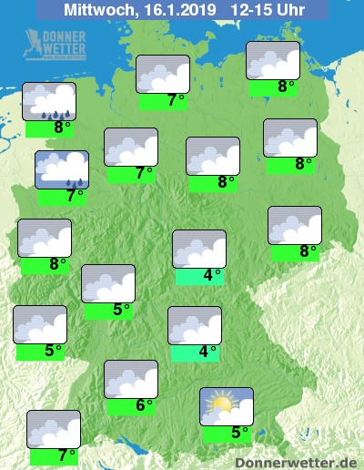 Am Nachmittag dominieren allgemein die Wolken. In den Küstenbereichen, sowie über Schleswig-Holstein fällt gelegentlich leichter Regen oder Sprühregen. Im weiteren Verlauf kommt im Emsland neuer Regen auf. Lediglich über dem südlichen Bayern lockert die Wolkendecke teilweise auf und die Sonne lässt sich blicken.