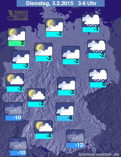 In der Nacht zum Dienstag fällt besonders nach Osten hin zeitweise Schnee, dabei besteht erhöhte Rutschgefahr! Auch in den anderen Landesteilen ist es oft stark bewölkt, aber überwiegend trocken. Vor allem im Süden und Südwesten bildet sich regional Nebel oder Hochnebel, dabei ist ebenfalls mit Glätte zu rechnen. Die Temperatur sinkt auf 2 Grad an der Nordsee und bis auf eisige -12 Grad in München.