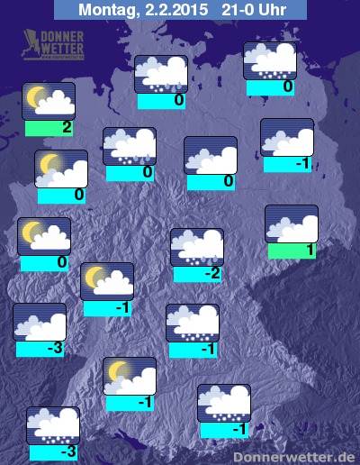 Heute Abend fällt sowohl im Süden, als auch in weiten Teilen von Norddeutschland zeitweise Schnee, zum Teil ist auch Schneeregen oder überfrierender Regen möglich. Es besteht erhöhte Glättegefahr! Im Osten bleiben die Wolken ebenfalls meist dicht, aber hier ist es überwiegend trocken, im Westen kann es meist etwas auflockern und es bleibt zumeist auch trocken. Die Abendtemperatur liegt bei 2 Grad in Wilhelmshaven und bei -3 Grad am Schwarzwald.