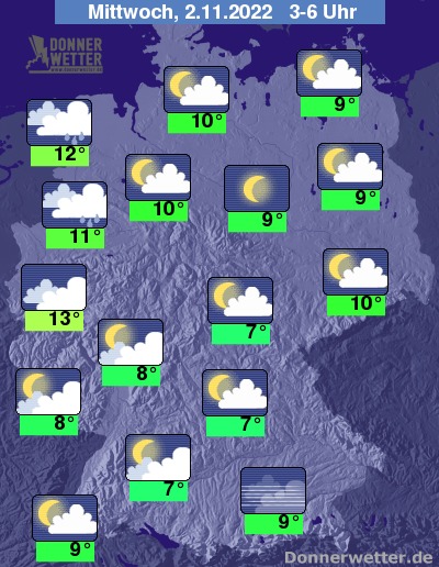 In der folgenden Nacht ist es anfangs überwiegend nur locker bewölkt, oft auch sternenklar. Von Westen her nimmt die Bewölkung jedoch rasch zu und nach Mitternacht sind vom Niederrhein bis ins Emsland einzelne Schauer möglich. Weiter nach Osten hin bleibt es bei überwiegend lockerer Bewölkung trocken. Die Temperatur sinkt auf 13 Grad in Düsseldorf und etwa 7 Grad in Nürnberg. Im Nordwesten weht ein zunehmend starker bis stürmischer Wind, an der Nordsee herrscht verbreitet Sturm.