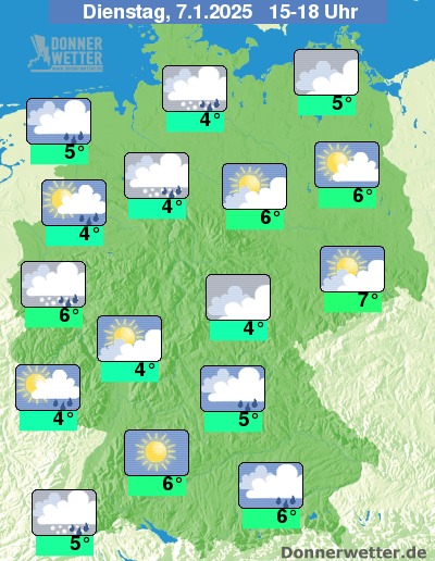 Am Dienstagnachmittag zeigt sich der Himmel wechselnd oder stark bewölkt, dabei muss vor allem im Westen und Nordwesten immer wieder mit Regen-, oberhalb von 500 bis 700 m auch Schneeschauern gerechnet werden.